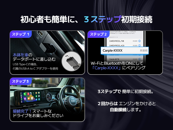 STEP 3. スマートフォンのWi-FiとBluetoothをオンにし、「CARPLE-XXXX」という名前のBluetoothに接続して、表示される許可案内をタップしてください。