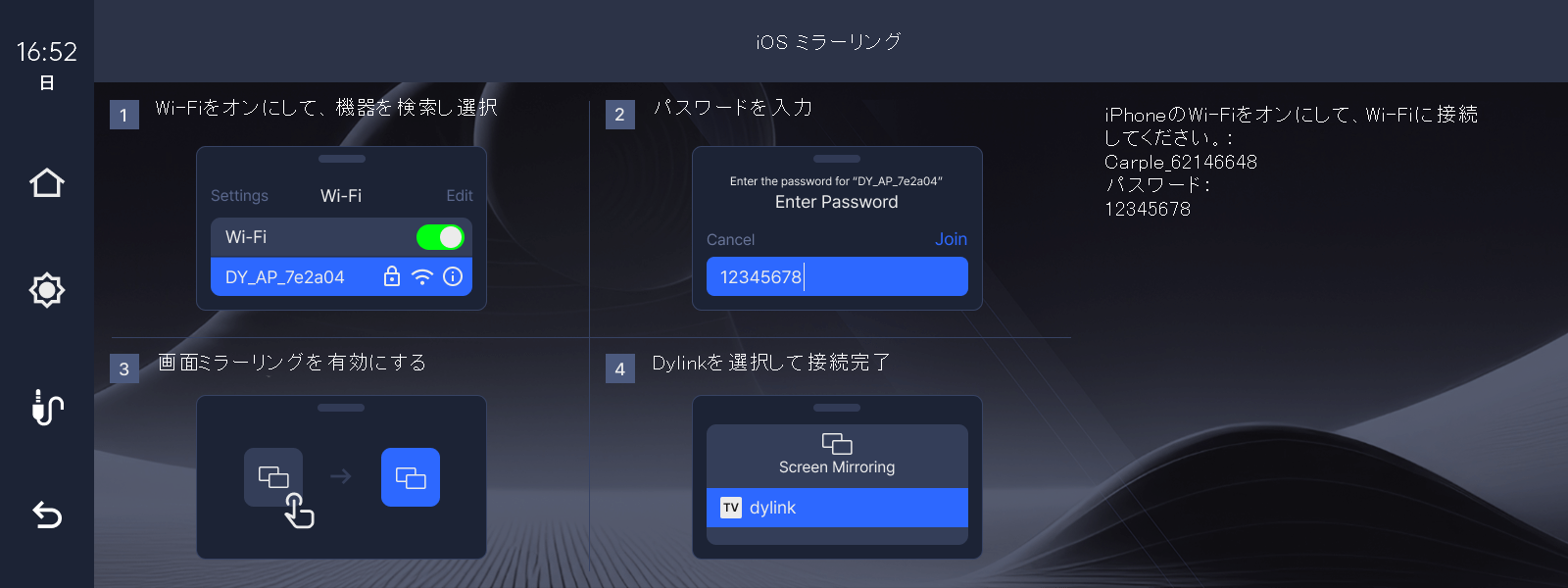 Carple 4K モニターは、iPhoneとAndroidスマホの両方でミラーリング機能を使用できます。以下の手順で各接続方法を確認できます。