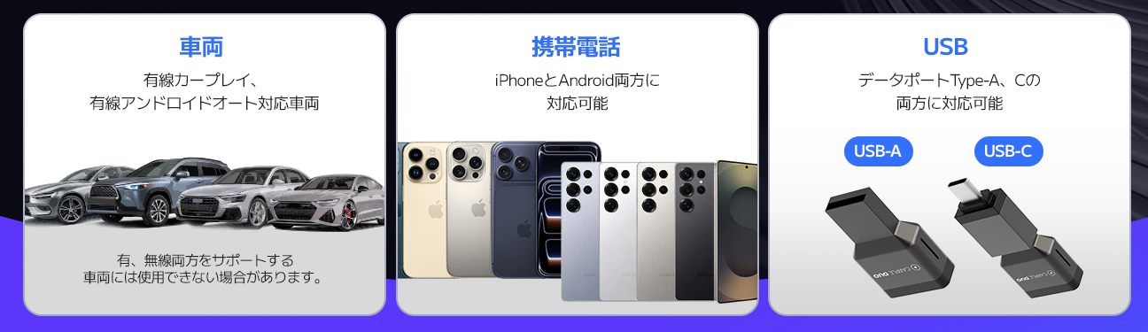 対応車種 : 純正で有線のCarPlay/Android Autoが搭載されている車両(98%以上の車種に対応)。